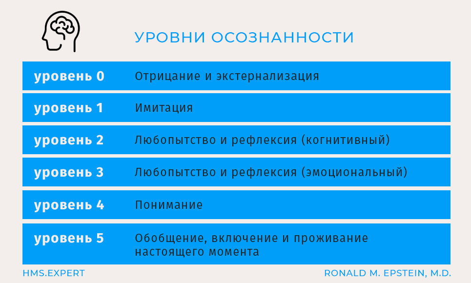 Осознанность - это целенаправленное, не вызывающее тревожности, рефлексивное проживание настоящего момента, которое может быть применено к любому аспекту практики (Epstein, 1999).
